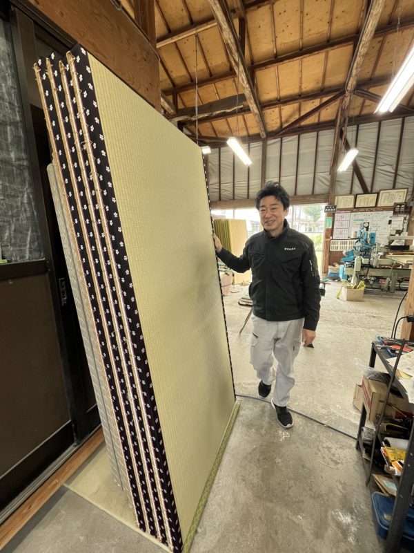 ↑メーターサイズの畳です。店主と比べるととても大きいサイズなのがわかりますね。