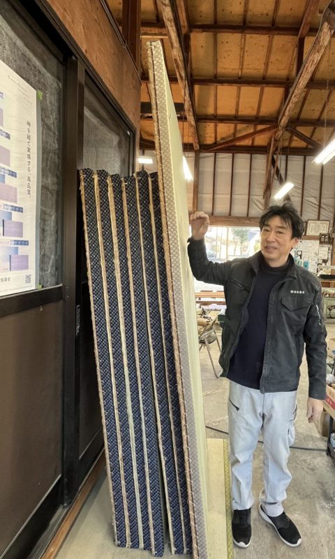 ↑店主(六代目)と2m22cmの畳と五八間(関東間)サイズの畳。